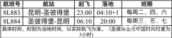 祥鹏航空昆明往返圣彼得堡航线由A330-300宽体客机执飞,航班号为8L883/884,飞行时间约10小时。航班具体时刻如下(如图):