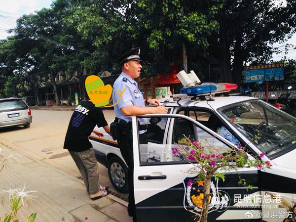 在西双版纳州民族中学考点,一考生忘记携带身份证,考点执勤民警立即驾驶警车带上考生赶往附近的旅游度假区派出所开具身份证明。在民警的帮助下2名考生顺利入场参加考试。
