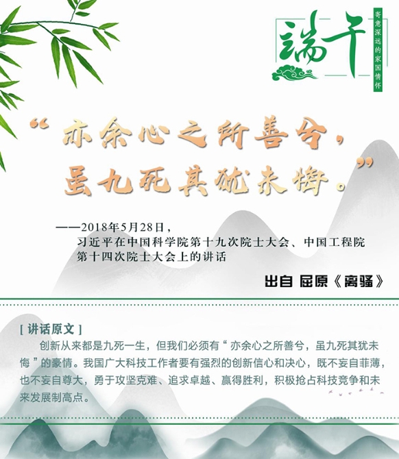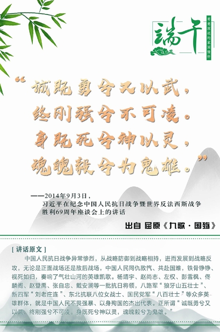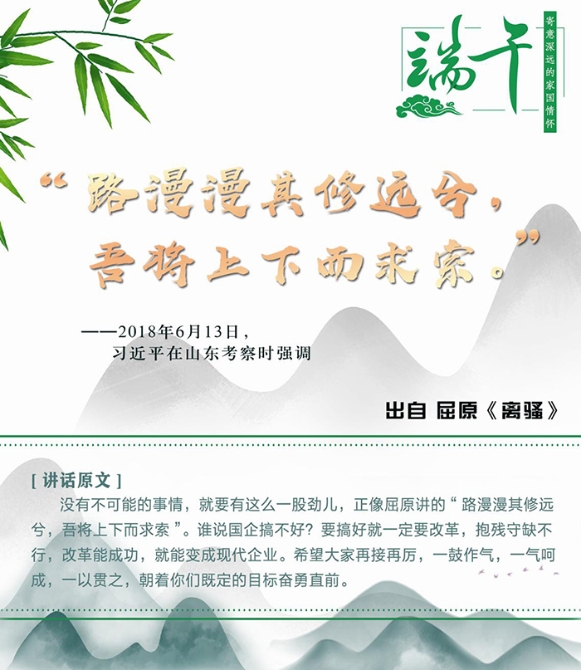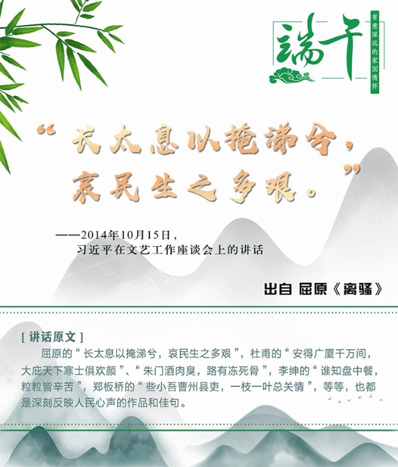 千百年来,端午节与端午文化凝结着中华民族的文化血脉和思想精华,端午二字也已成为传承、弘扬、激发民族精神和爱国情感的载体,是有着符号意义的“根”。这一天,人们纷纷纪念屈原,在思接千古的家国情怀中积蓄前行的力量。习近平总书记曾在不同场合多次提及屈原,并引用屈原诗歌中的名句阐述思想,寄意深远。今天,让我们重温习近平总书记平实的话语,来一场感受中华文化深厚底蕴的寻“根”之旅——去找寻古人精神与当下需求的连接点,感受中华民族传统风骨中的爱国主义精神,思考民族精神的传承、发展与创新。