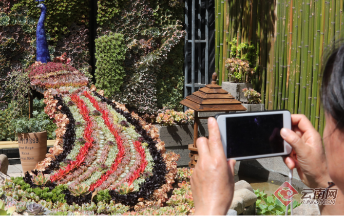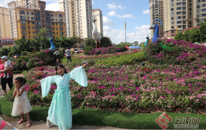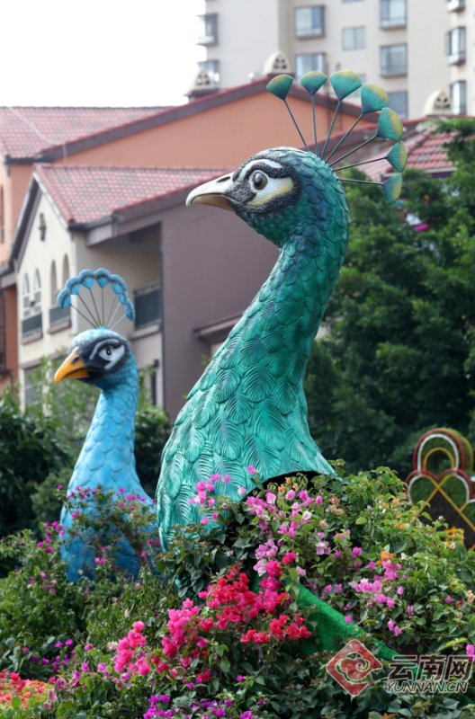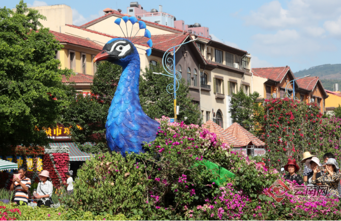 中国昆明国际观赏苗木展览会暨2019宜良花街节上靓丽的造型孔雀三角梅花景