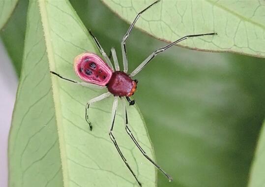 雄蜘蛛个头较小,背上有红色粉色花纹。通讯员林业杰/摄