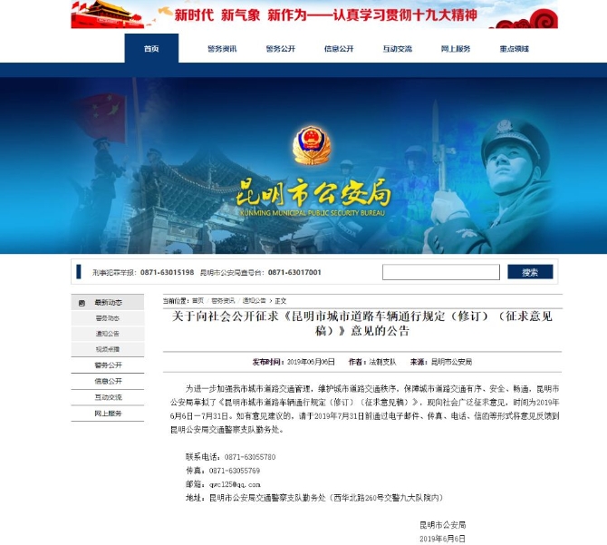 6月6日,昆明市公安局在官网上发布《关于举行<昆明市城市道路车辆通行规定(修订)(征求意见稿)>听证会的公告》,其中透露:征求意见稿拟对核定载客数十三座(含)以上的载客汽车、小货车、大货车、摩托车的行驶区域进行划定。本次听证会拟6月21日(星期五)14时举行,现于6月6日-7月31日向社会广泛征求意见。如有意见建议的,请于此期间通过电子邮件、传真、电话、信函等形式将意见反馈到昆明市公安局交通警察支队勤务处。