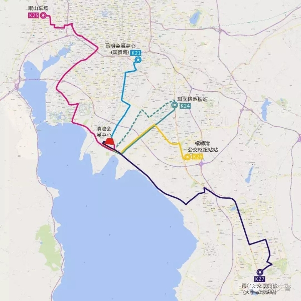 昆明滇池会展中心在运常规公交线路走向示意图: