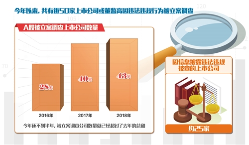 截至6月10日,今年以来,共有近50家上市公司或上市公司的“董监高”因违法违规行为被立案调查。而2016年、2017年和2018年这3年中,A股分别有28家、40家和43家上市公司被证监会立案调查。今年还不到半年,被立案调查公司数量就已经超过了去年的总和,创下新高。