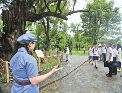 6月11日,参加“记者再走长征路”主题采访活动的记者在江西瑞金叶坪革命旧址群采访。新华社 记者李任滋/摄