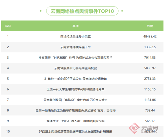 当月“云南网络热点舆情事件TOP10”榜单上,“孙小果案”相关舆情热度最高。云南多地持续高温干旱和杜富国获“时代楷模”称号分别排在第二、第三。此外,云南省委原书记秦光荣主动投案、31省份一季度GDP正式公布云南增速夺得榜首以及玉溪一女大学生曝网约车司机称摸腿可免单等事件都见诸榜上。