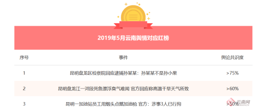 据云南网社区舆情中心统计,2019年5月云南网络热点舆情事件共10起。梳理发现,涉及全省范围舆情事件共发生5起,在16州市热点舆情中,昆明3起,玉溪、红河各1起。