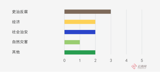 从舆情涉事领域来看,吏治反腐3起,经济、社会治安以及其他各2起,自然灾害1起。(云南网 记者张东奎)