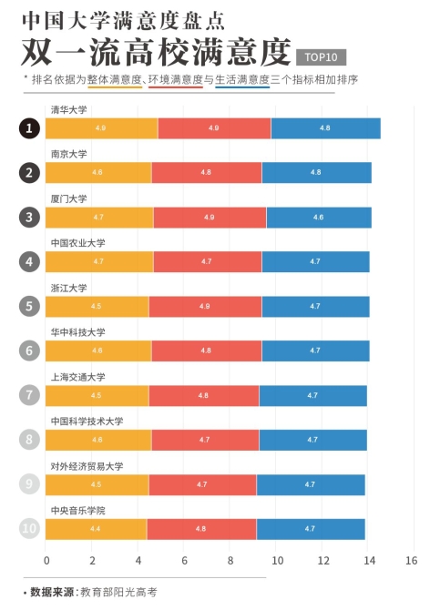 首先是双一流高校的满意度排名——可以看到,清华大学在各项指标均获得接近满分的评价(5分为满分),居双一流高校之首。