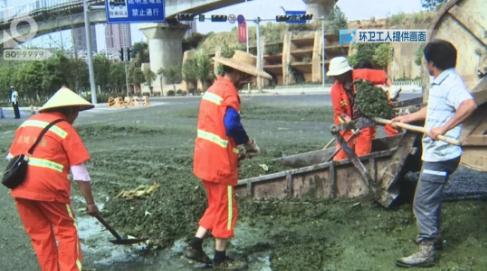 环卫工人赵阿姨说,他们早上9点就赶到现场了,当时,呈黄路阿拉收费站往大板桥方向近2公里范围内,基本都被碾压过的烂菜叶覆盖,路面上一片绿油油,还散发着恶臭。