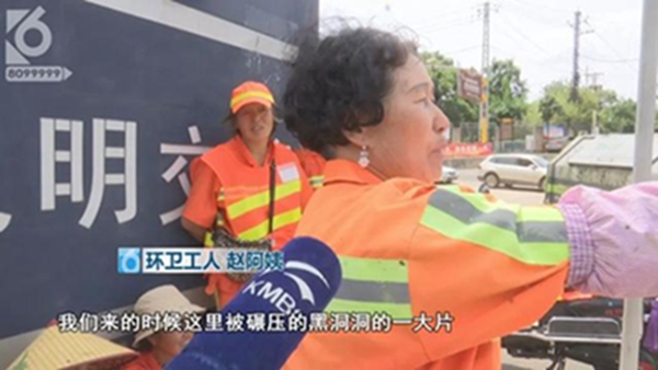 环卫工人:“我们已经拉走三四车了,都是浆,烂菜叶很不好扫,粘黏得很,增加了我们的负担又影响环境。”