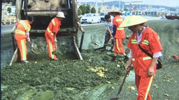 环卫部门立即调集车辆和人员对污染路面进行清理,光烂菜叶就拉了三车没拉完。而且菜叶已经被碾压成泥浆,清扫起来十分费力。