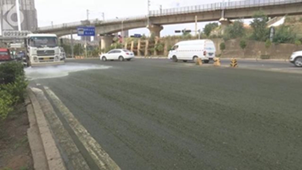 记者赶到现场时,洒水车开始对被污染的路面进行冲洗。