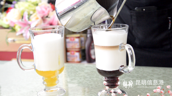 创意咖啡。根据不同的密度。上面为牛奶,下面是果酱,咖啡在中间。
