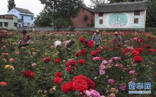 6月17日,村民在玫瑰小镇玫瑰园里除草。小镇每年带动务工群众600余人,乡亲们不用出远门在家门口务工。 新华社 记者陶明/摄
