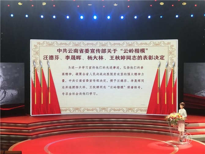 “云岭楷模”发布仪式现场宣读了《中共云南省委宣传部关于“云岭楷模”汪德芬、李晟晖、杨大林、王秋婷同志的表彰决定》。《决定》认为,汪德芬、李晟晖、杨大林、王秋婷同志的先进事迹,展现了对党忠诚、信念坚定的政治品质,牢记宗旨、忠于使命的责任担当,开拓进取、攻坚克难的拼搏精神,恪尽职守、敬业奉献的务实作风,生动诠释了培育和践行社会主义核心价值观的要求,不愧为扶贫一线干部群众的杰出代表。