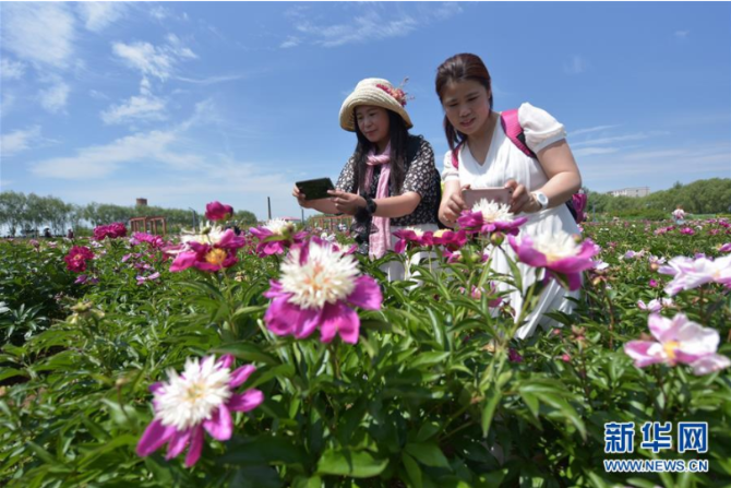 参观者在黑龙江农业经济职业学院校园内欣赏和拍摄芍药(6月19日摄)。 新华社发张春祥/摄