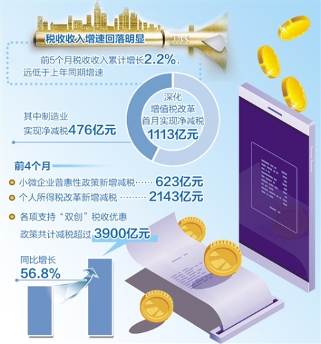 税收收入增速回落明显,前5个月税收收入累计增长2.2%,远低于上年同期增速;深化增值税改革首月实现净减税1113亿元,其中制造业减税效果最为明显,实现净减税476亿元;前4个月,各项支持“双创”税收优惠政策共计减税超过3900亿元,同比增长56.8%……