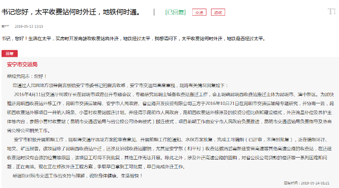 6686体育讯(昆明日报 全媒体记者吴劲松)近日,有网友通过《地方领导留言榜》向安宁市留言,表示自己生活在太平,买房时开发商鼓吹收费站将外迁,地铁经过太平,想请问下,太平收费站何时外迁,地铁是否经过太平?
