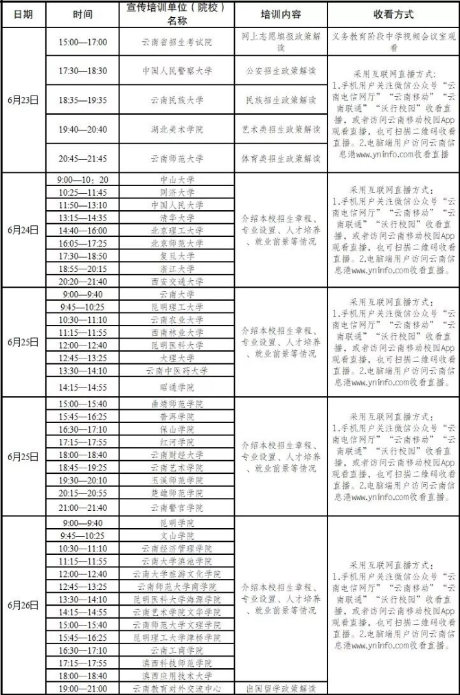 为全面深入宣传我省平行志愿政策,帮助广大考生了解院校招生信息,科学合理填报志愿,定于6月23—26日开展云南省2019年普通高校招生网上志愿填报宣传培训工作。本次宣传培训分为志愿填报指导、招生院校及出国留学政策宣传两部分,现将有关事项通知如下: