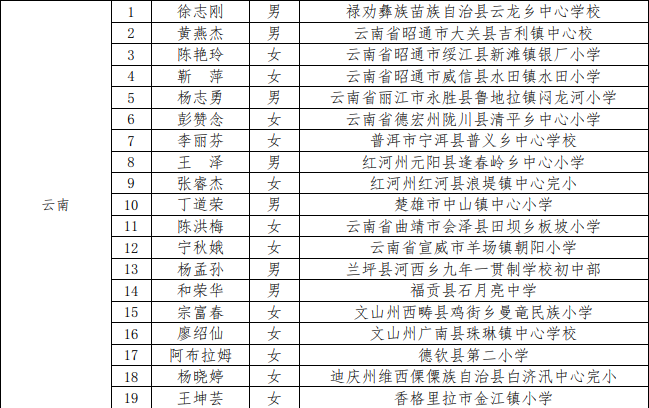 为造就一支高素质乡村教师队伍,加快推进乡村教育现代化,2019年继续实施乡村优秀青年教师培养奖励计划。经各省教育行政部门推荐、专家审核和遴选等环节,确定培养奖励计划人选名单,其中,云南有19位老师拟入选,名单如下