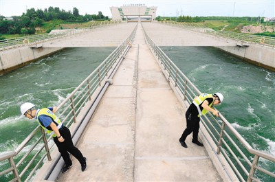 2018年8月14日,南水北调中线干线荥阳管理处工作人员在南水北调索河渡槽附近巡查渠道安全。新华社 记者鲁鹏/摄