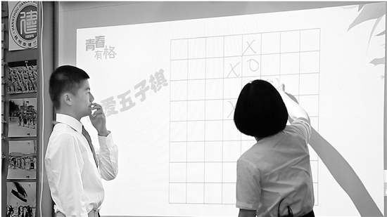 “班里有会下五子棋的同学吗?有谁想和老师下一盘的?”一上课,黄老师轻松的开场白让学生有些不知所措,但是和老师下棋这么有趣的事,大家都忍不住举手了。