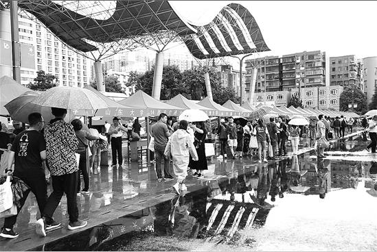 虽然天公不作美,但考生和家长们依旧热情不减。全天的活动吸引了近5000人入场,考生和家长打着雨伞在各个展位前咨询,各所院校的老师也都耐心答疑解惑。