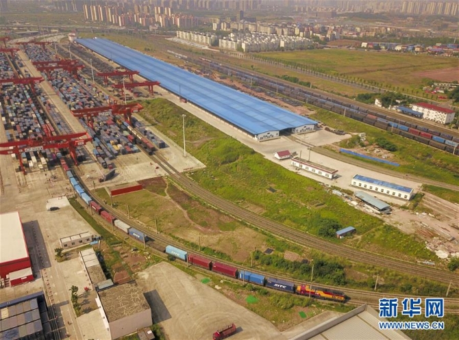 首列“陆海新通道”铁海联运班列印度尼西亚专列驶出重庆团结村中心站(4月26日无人机拍摄)。 新华社记者 刘潺 摄