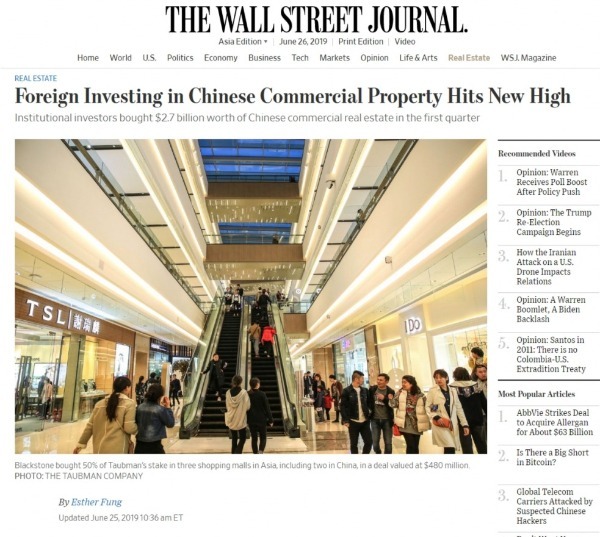 今年2月,全球著名投资机构黑石集团斥资4.8亿美元收购了塔博曼购物中心(Taubman Centers Inc.)三家亚洲购物中心50%的股权,其中两家在中国,一家在韩国。