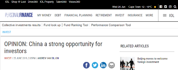 另据南非独立新闻网6月25日报道,南非金融机构RisCura分析师安德鲁·范比利翁(Andrew van Biljon)认为,尽管中美贸易关系持续紧张,但中国政府的政策和积极的市场变化,能够确保投资中国是一个良机。