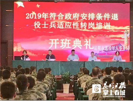 6月27日至28日,由昆明市退役军人事务局主办的首场“2019年度全市符合政府安排工作条件退役士兵适应性转岗培训”开班。2019年度全市符合政府安排工作条件的400余名退役士兵参加了适应性转岗培训。