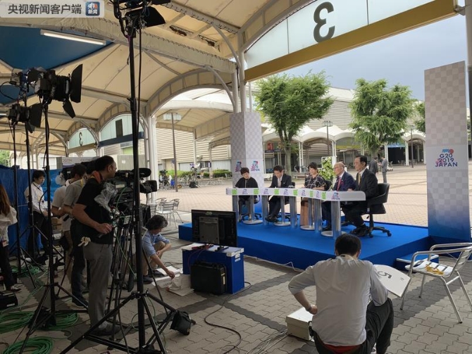 △6月29日上午,大阪国际会展中心入口处的现场演播室。日本一档政治谈话节目《Wake Up! Plus》正在直播,嘉宾们讨论的高频词是“中美”。(记者 沈忱拍 摄)