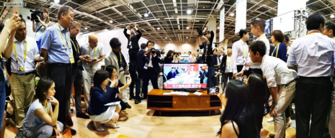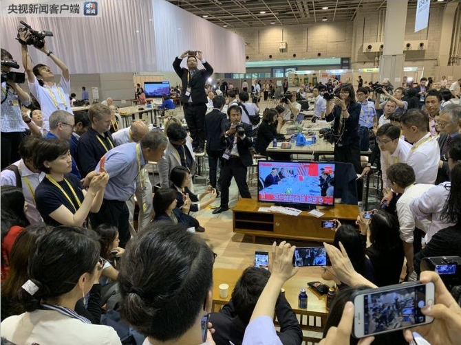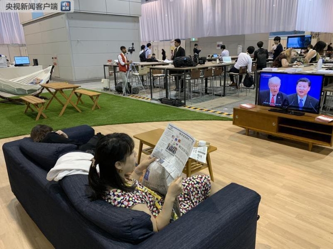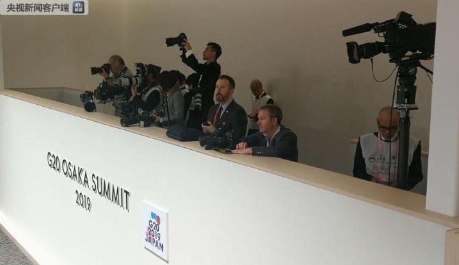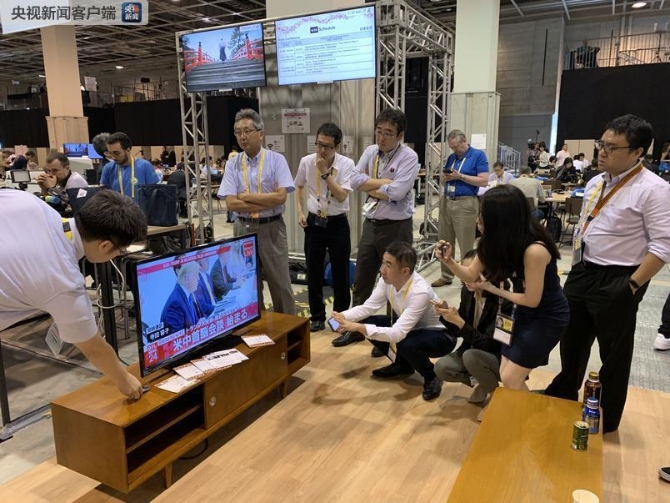 △NHK对中美元首会晤做了短暂的直播,G20新闻中心的一块电视屏幕吸引了各国记者。通过一组图片来感受一下这个“吸睛”的过程。(记者 沈忱 荆伟 李思默 拍摄)