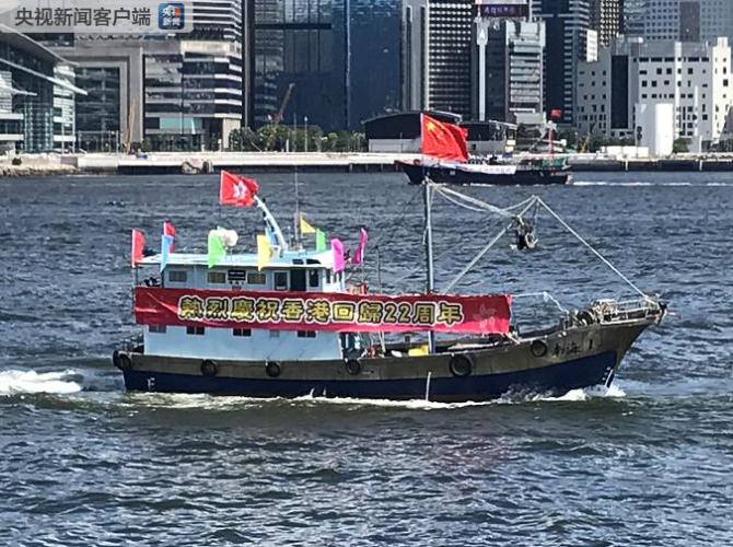 据了解,香港渔民团体联会在维多利亚港举行“香港渔民庆国庆、回归及撑警渔船巡游”。70艘渔船由港岛西环出发往东行,途经中环及湾仔海岸,在北角码头折返并经过尖沙咀后返回西环码头。每艘渔船上都挂着“热烈庆祝香港回归22周年”,“全力撑警保卫家园”等支持警察执法及庆祝回归的横幅,有的渔船拉响号笛,吸引了维港两岸众多市民游客观看。