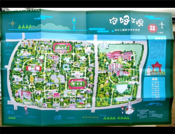 有了这份地图,就可以将工院“一网打尽”,可以称得上“地图在手,工院我有”。据悉,这份手绘校园地图正是由四川工程技术学院赵欣等17名学生在两名老师的指导下,花费了一年时间,利用课外时间创作的300余幅图画,最后融合成手绘地图。地图除了对各个教学楼进行介绍外,还对学校教学、学生社团文化、校园周边美食以及学校周边公共交通等,进行了详尽介绍。为了方便对外交流,还配备了中英文版。