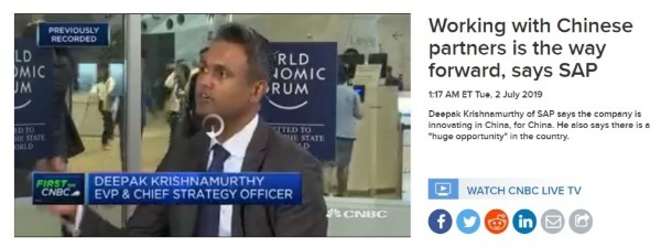 在中国大连举行的夏季达沃斯论坛上,思爱普执行副总裁迪帕克·克里希纳穆尔蒂(Deepak Krishnamurthy)表示:“我们相信这种合作模式。”