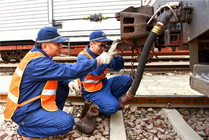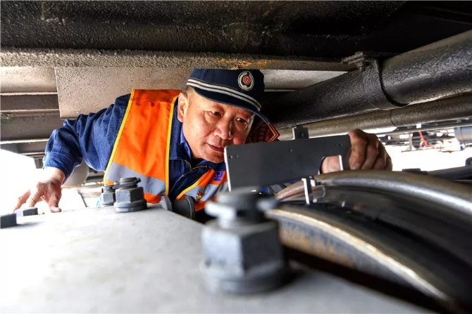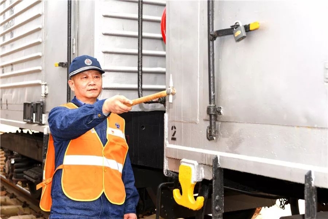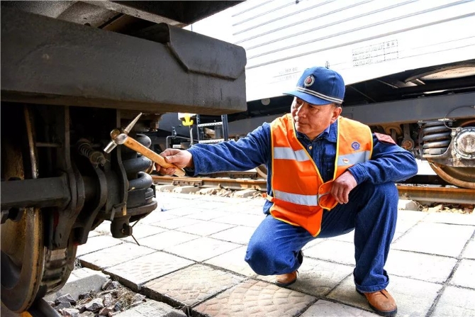 东江琦很专注,先用手摸摸关键部件,再用锤子敲击,并侧耳倾听。他说:“声音清脆,就说明部件没有故障。”如果碰到不能敲击的部位,他就会瞪大眼睛认真查看,绝不放过一个安全隐患。经过仔细排查,他发现一处减震圆簧裂纹。在紧张抢修后,东江琦及时消除了隐患,保证了车组正常运行和货物及时送达。
