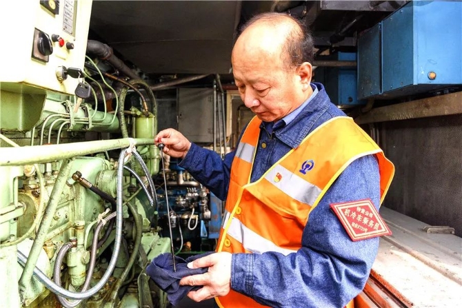 郑州机保段304列机械冷藏车组乘务长东江琦打开机械工作间,一股热浪扑面而来,3台柴油发电机发出震耳的轰鸣。很快,豆大的汗珠就在他的额头、脸上冒出来,并不时地往下滚落。查看柴油机运行状况,观测水温、气温和压力……东江琦按照作业流程,同时也是长期形成的工作习惯,一项不漏地进行检查。这样的动作,每隔20分钟他就要重复一次,30年来,只要值乘,雷打不动。