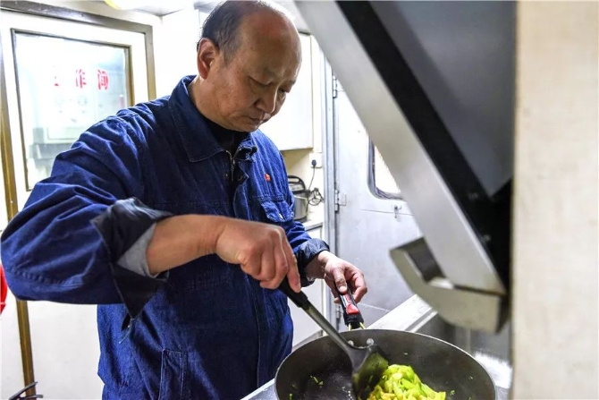 东江琦一年中近一半的时间都在工作车内度过。车内放置有床铺、桌椅、冰箱、电视等家具电器和生活用品,狭窄的过道仅能容纳一个人通过。两名乘务员经过常年配合,早已达成默契。“师傅做饭,我就打扫卫生。”闫海宁说。