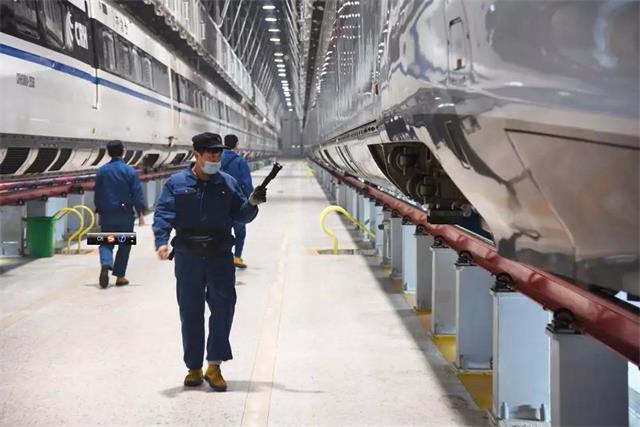 济南东动车所的检修机械师在对一列复兴号进行检查。(2019年2月12日摄)