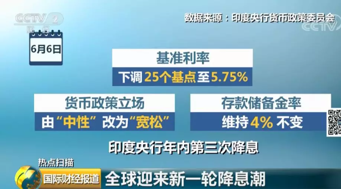 6月6日,印度央行货币政策委员会公布利率决议,宣布将基准利率下调25基点至5.75%,并将货币政策立场由“中性”改为“宽松”,维持存款储备金率4%不变。这也是继2月和4月后,印度央行年内第三次降息。