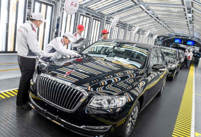 2019年4月9日,工人在位于吉林长春的一汽红旗总装车间内进行车辆静检作业。(新华社记者许畅摄)