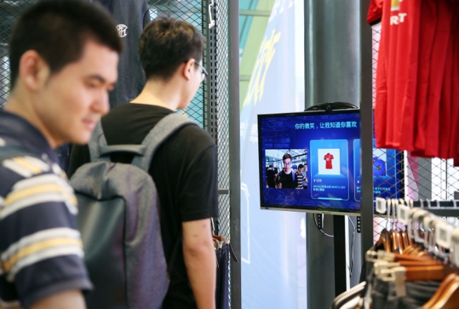 2017年8月28日,位于江苏省南京市的苏宁全国首家“无人店”内,商店电脑系统为消费者智能推荐商品。(新华社记者李雨泽摄)