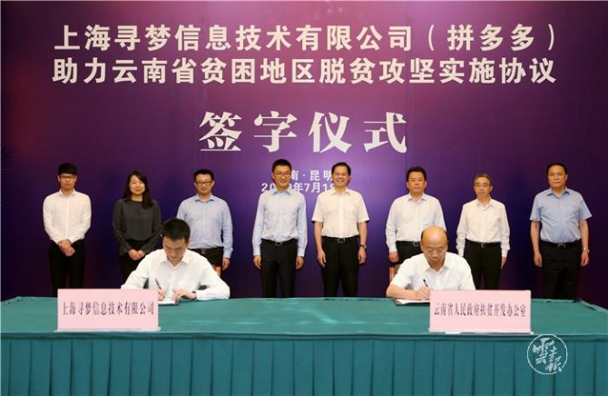 拼多多今年将投入1亿元,在云南74个贫困县建“多多农园”。7月19日上午,云南省人民政府扶贫开发办公室与上海寻梦信息技术有限公司(拼多多)在昆明签署助力云南省贫困地区脱贫攻坚实施协议。