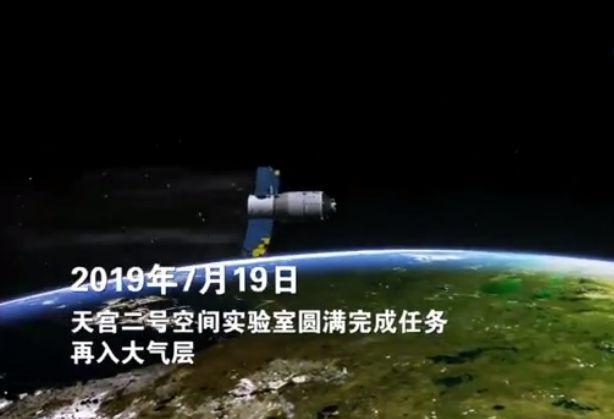 2019年7月19日,天宫二号空间实验室圆满完成任务,再入大气层,少量残骸落入指定海域。