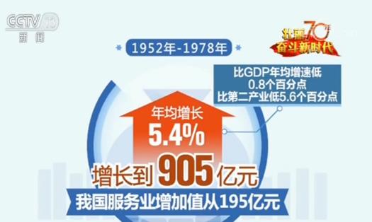 数据显示,1952-1978年,我国服务业增加值从195亿元增长到905亿元,年均增长5.4%,比GDP年均增速低0.8个百分点,比第二产业低5.6个百分点。1978年末,我国服务业增加值占国内生产总值比重只有24.6%,排在三次产业最末位,比第一产业、第二产业分别低3.1和23.1个百分点。