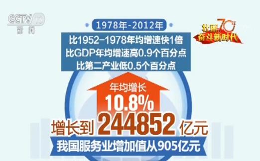 改革开放以来,服务业进入快速发展期,1978-2012年,我国服务业增加值从905亿元增长到244852亿元,年均增长10.8%,比1952-1978年均增速快1倍,比GDP年均增速高0.9个百分点,比第二产业低0.5个百分点。1985年服务业增加值占GDP的比重超过第一产业,2012年超过第二产业,上升至45.5%。