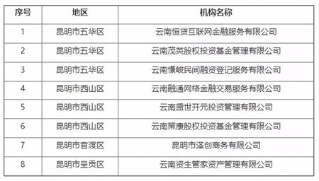 7月22日,云南省地方金融监督管理局网站发布了《关于网络借贷信息中介机构市场退出的公示(第四批)》,公示称,按照国家关于P2P网贷风险专项整治工作的要求,云南省对纳入范围的P2P网络借贷信息中介机构和民间融资登记服务机构开展了风险整治工作。并公示了第四批(7家)拟退出市场的机构,公示时间从7月22日起至8月6日。如有异议,可向省、相关州市、县(区)风险专项整治联合工作办公室反映。