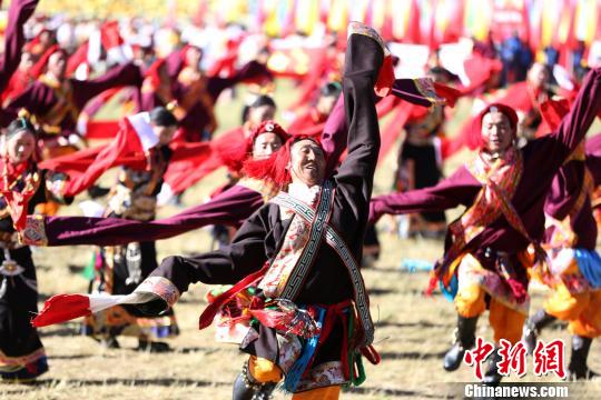 图为玉树传统赛马节暨雪域格萨尔文化艺术节和三江源水文化节开幕式现场伊舞展示。罗云鹏 摄